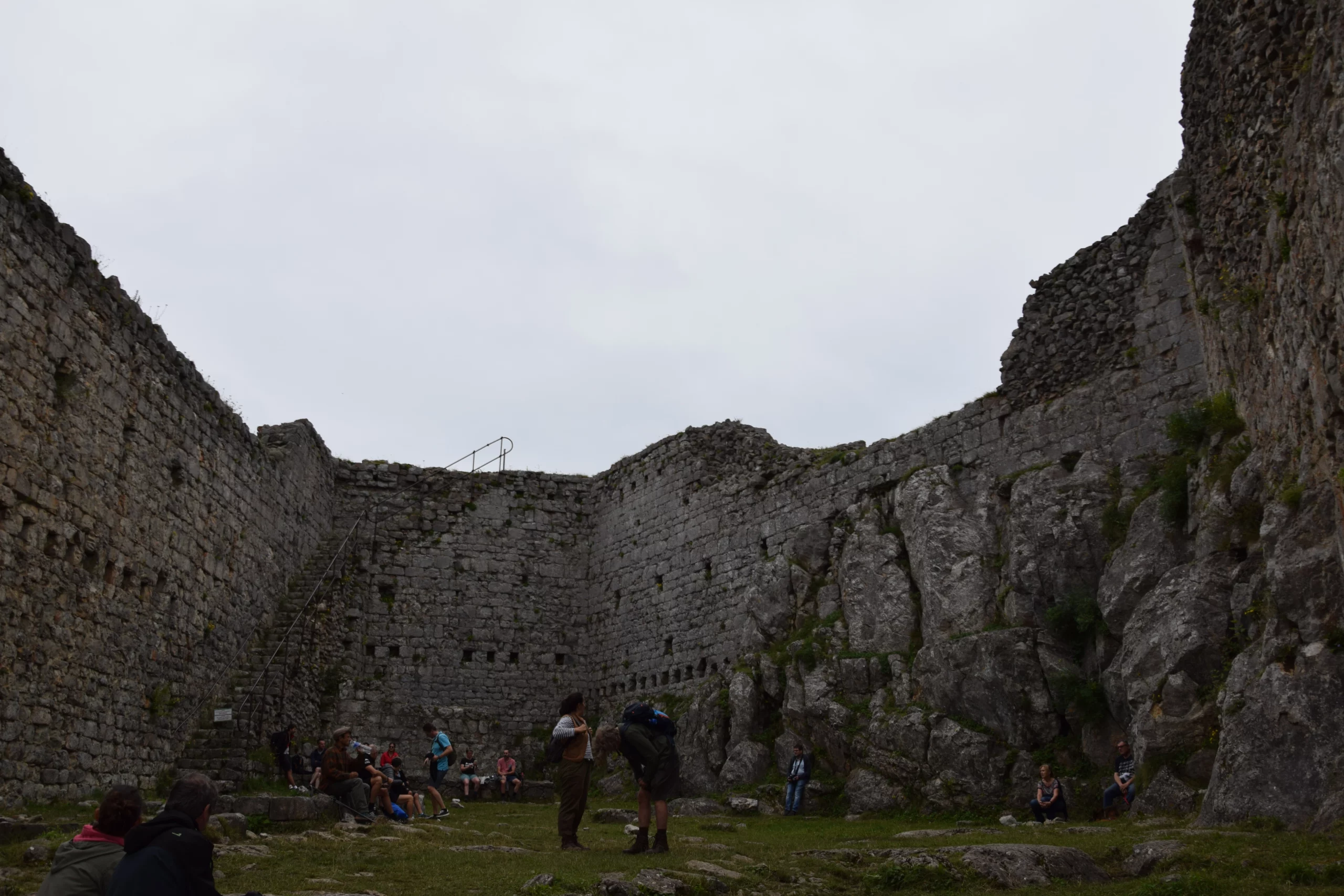 Sur les terrasses en contrebas, côté nord-ouest et nord, on distingue nettement les murets en pierre sèche des anciennes maisons du castrum, les murs de soutènement, les emplacements des citernes collectant l’eau de pluie et les restes d’une enceinte périphérique. Ces ruines rappellent qu’avant d’être une simple forteresse, Montségur fut un village perché dense, structuré par des ruelles, des escaliers taillés dans le rocher et des petits logis mêlant pierre et bois.